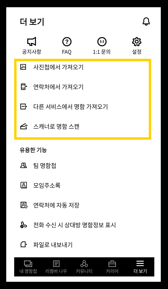 기존에 찍어놨던 명함을 사진첩에서 꺼내오거나 연락처에서 가져오기 등