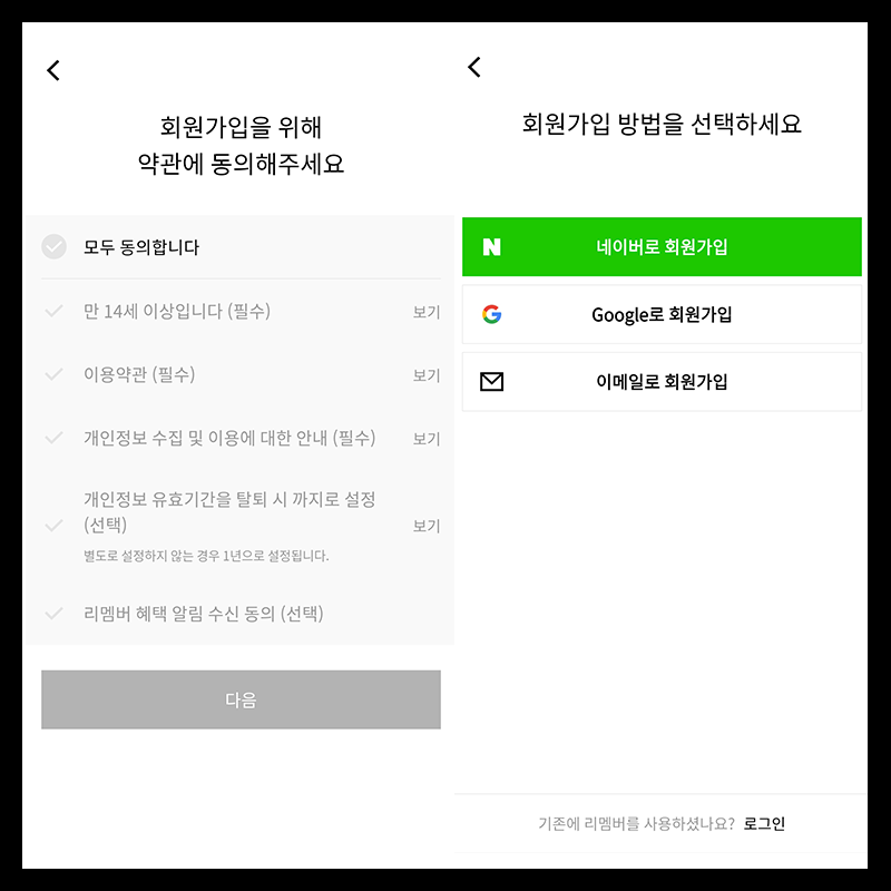 기존사용자는 바로 로그인 화면으로, 신규 사용자는 회원가입을 유도하고 있으며