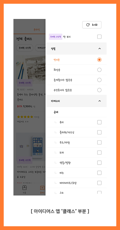 앱 메뉴는 크게 작품/클래스/검색/카테고리/내정보