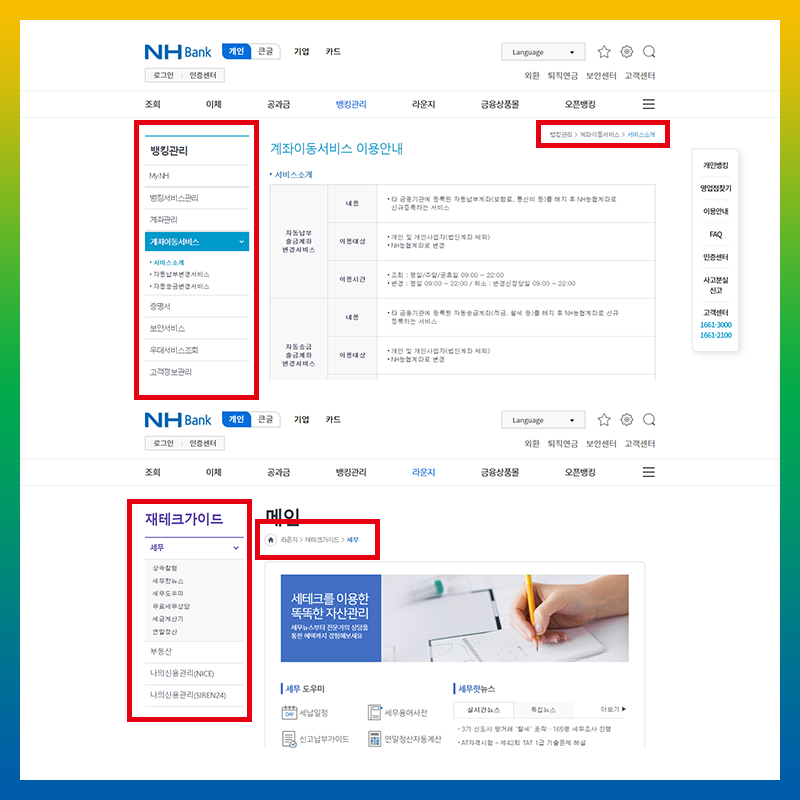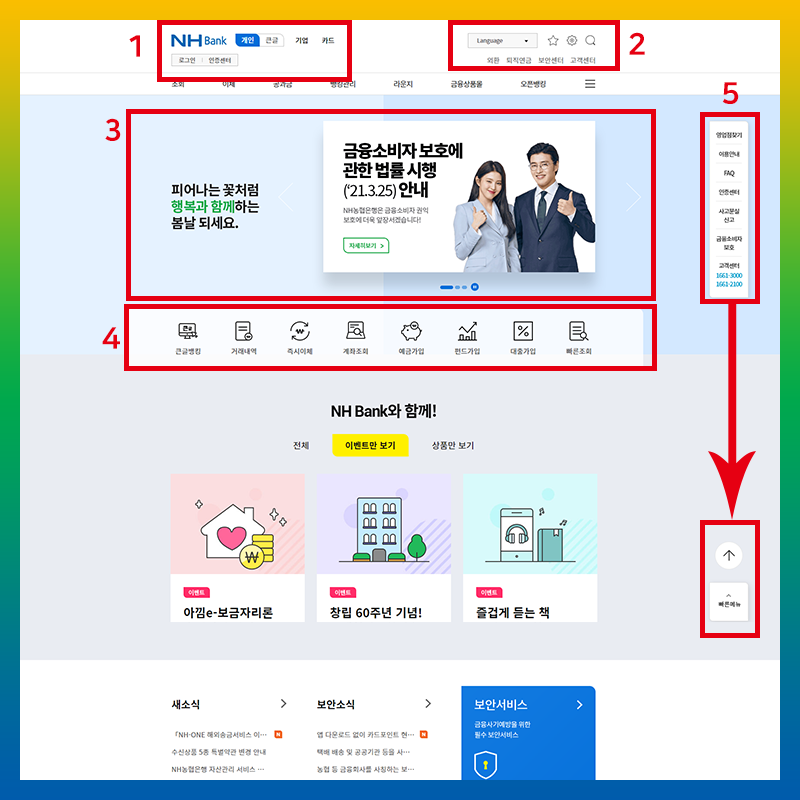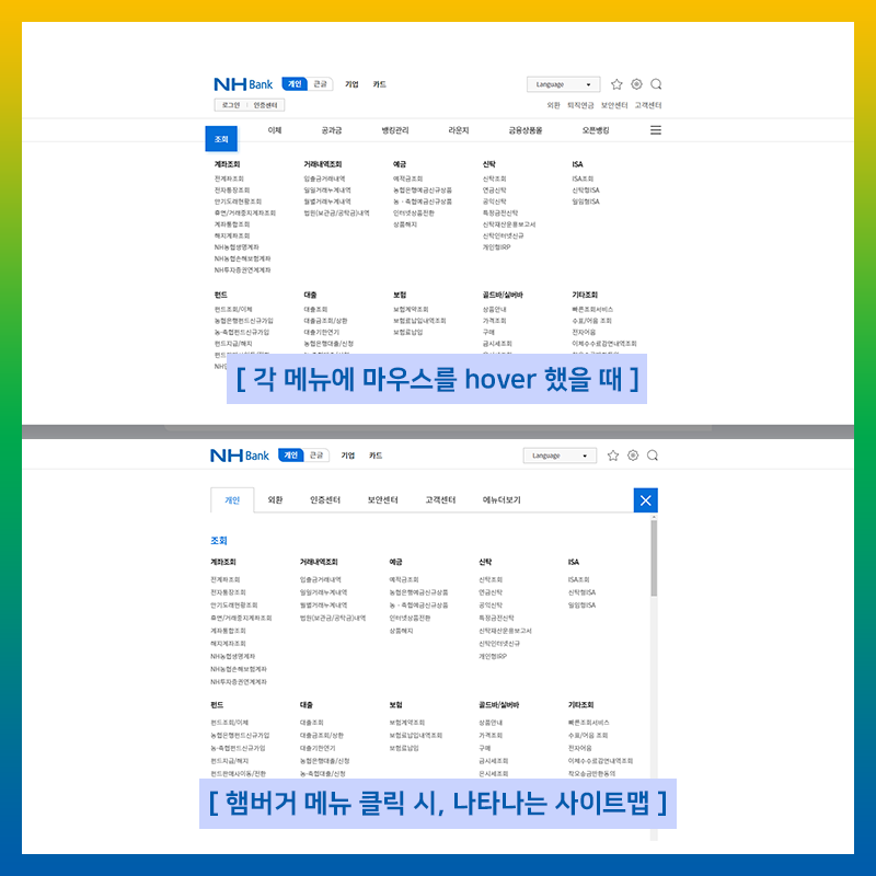 이러한 UI를 통해 농협은행 사이트는 최대한 고객 중심, 고객 관점에서 바라보았음을 알 수 있습니다.