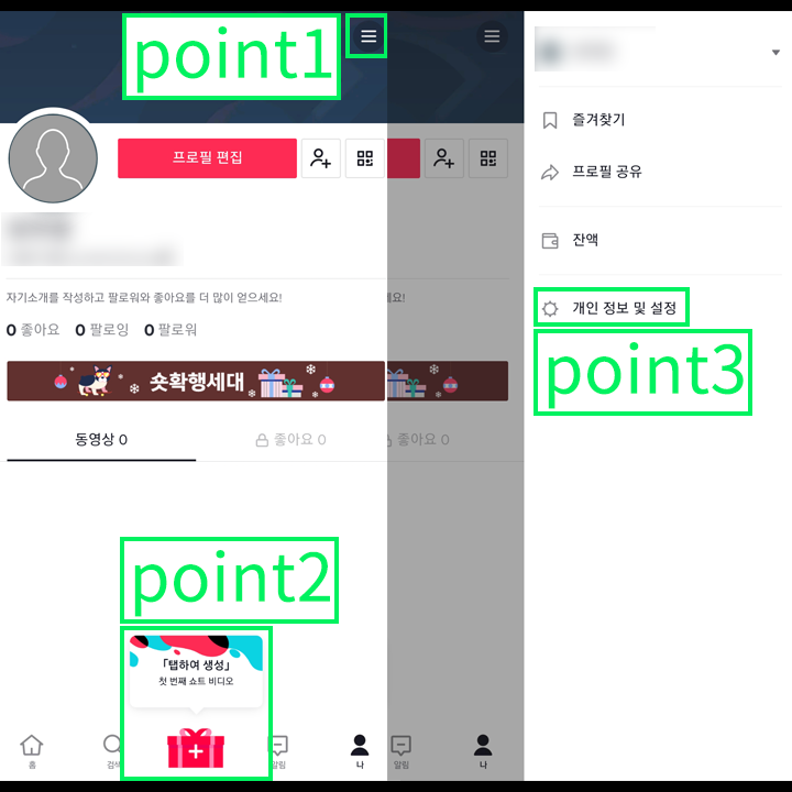 유투브는 서브로 작은 화면이었다면 틱톡은 프로필 화면이 따로 존재합니다.