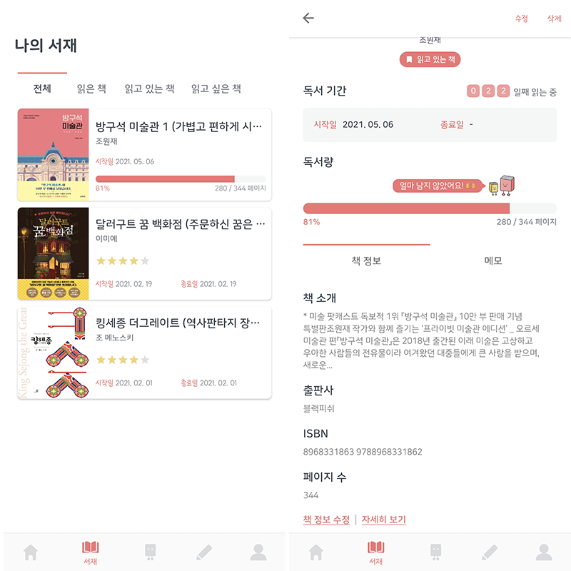 이 정도면 나중에 이 어플 하나만 봐도 어떤 책이었는지 내가 어떤 생각을 하면서 읽었는지