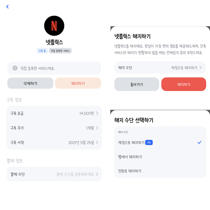 해지 수단을 계정, 웹, 전화 등을 통해서 할 수 있다고 하네요~