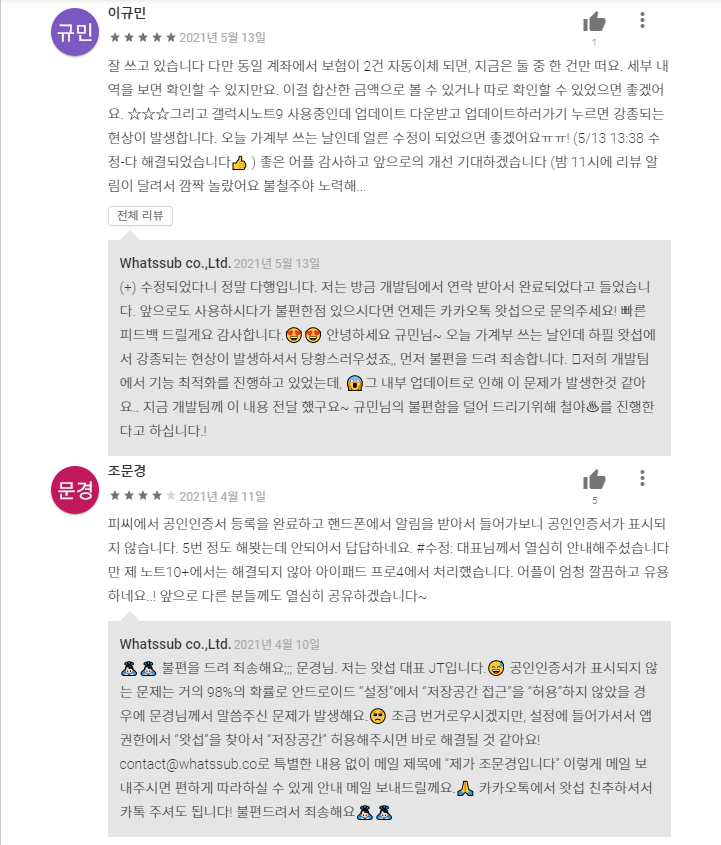 또 한 가지 감동(?)이었던 건 구글 플레이스토어에 달린 개발자분들의 댓글이었는데요.