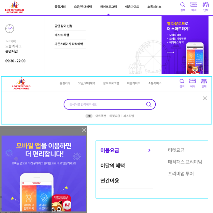 전반적으로 롯데월드의 안내판이나 홈페이지 스타일의 UI가