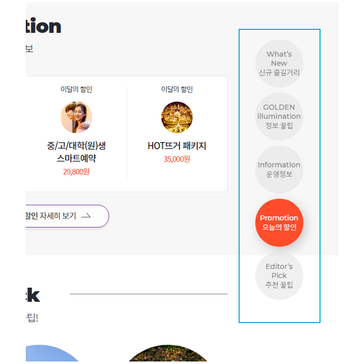 어트렉션의 버튼은 상단의 배경색을 따라서 흐름이 이어지는 느낌을 받을 수 있었어요.