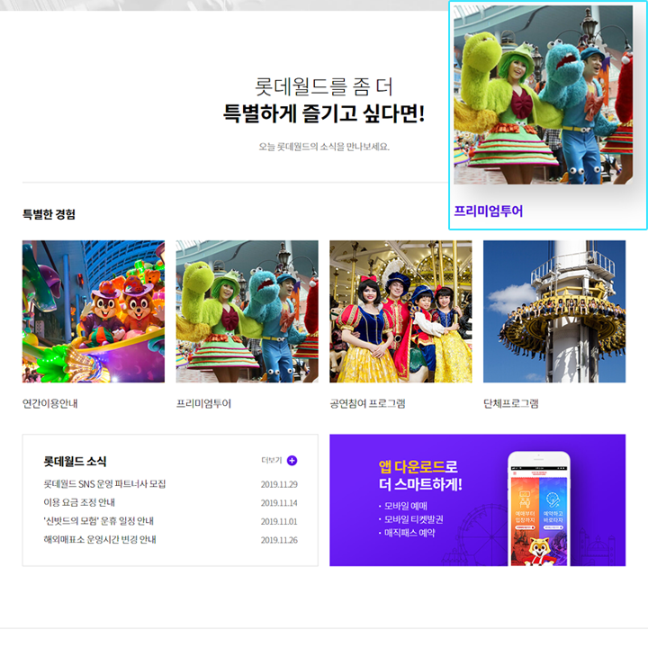 롯데월드의 소식이나 앱을 이용할 수 있도록 안내하고 있어요.