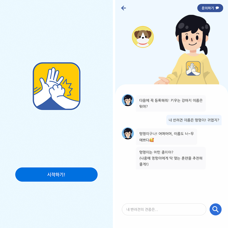 시작하기 버튼을 누르면 훈련사님과의 대화창이 열립니다.